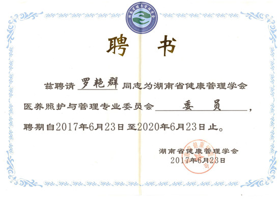湖南普親老齡產(chǎn)業(yè)發(fā)展有限公司培訓(xùn)主管羅艷群女士,被聘請為湖南省健康管理學(xué)會醫(yī)養(yǎng)照護(hù)與管理專業(yè)委員會委員。
