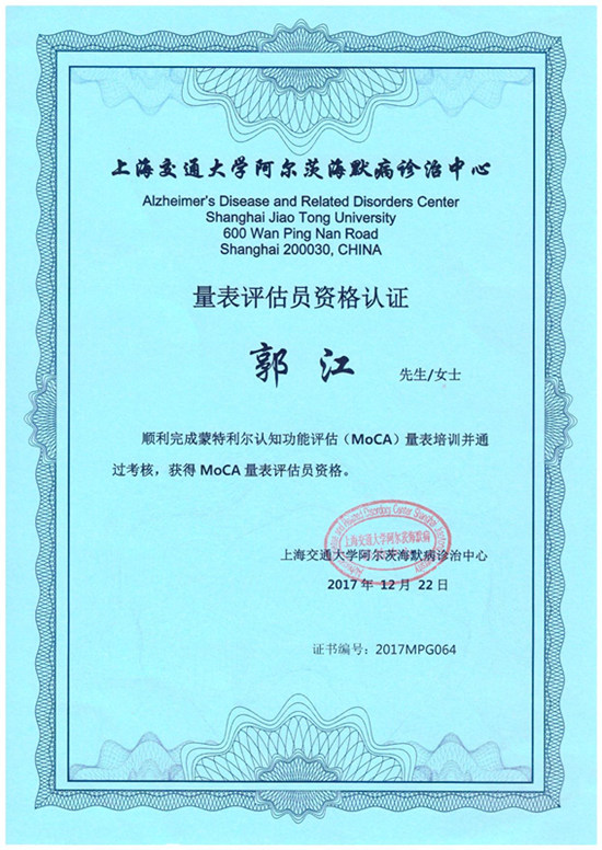 湖南普親老齡產(chǎn)業(yè)發(fā)展有限公司心理咨詢師郭江女士,完成蒙特利爾認(rèn)知功能評估(MoCA)量表培訓(xùn),并通過考核,獲得MoCA量表評估員資格。
