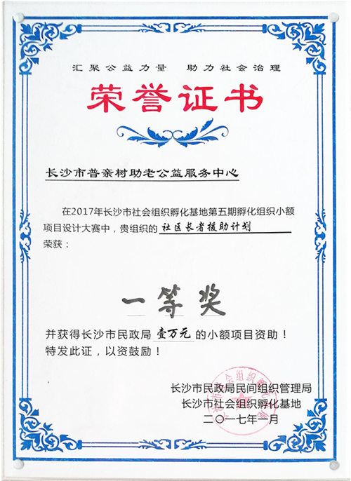 長(zhǎng)沙市普親樹助老公益服務(wù)中心的社區(qū)長(zhǎng)者援助計(jì)劃,榮獲長(zhǎng)沙市社會(huì)組織孵化基地項(xiàng)目設(shè)計(jì)大賽一等獎(jiǎng)。